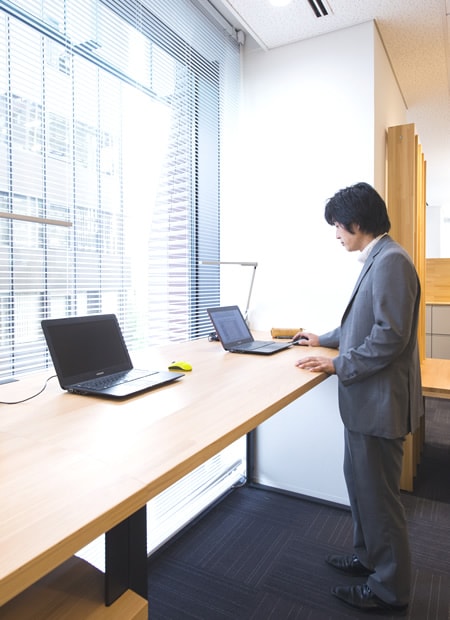 たとえば、立って仕事をするデスクで集中力を高めたり、コミュニケーションの活性化をはかりながら健康を増進するコーナーづくりをご提案するなど、プロダクトの面からもワークサイズをサポートしています。